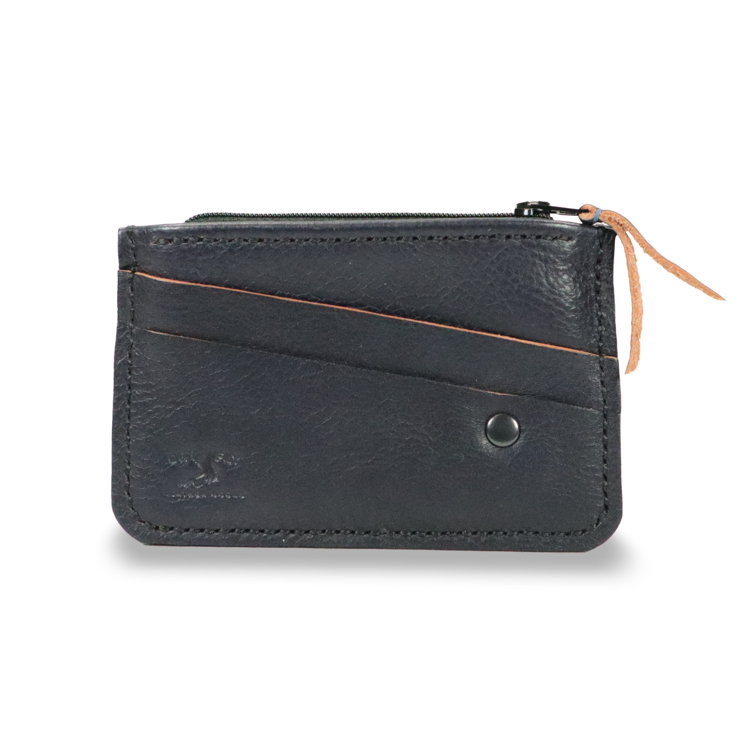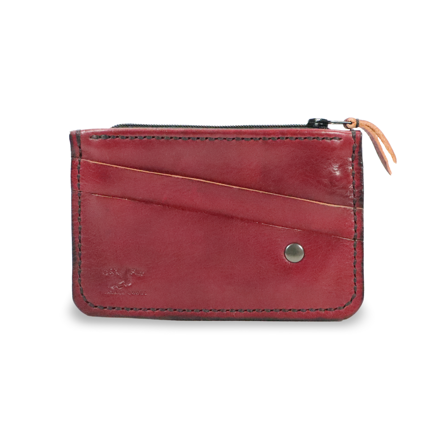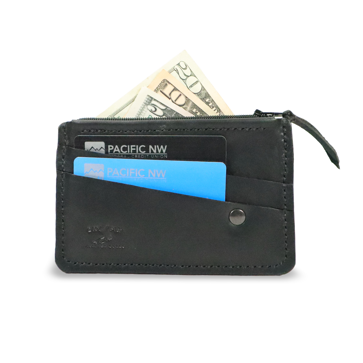 The minimalist design of this card + zipper wallet is hand-stitched for superior strength and impresses with a slim profile. It has three pockets total - two outer card pockets and one middle zipper pocket.